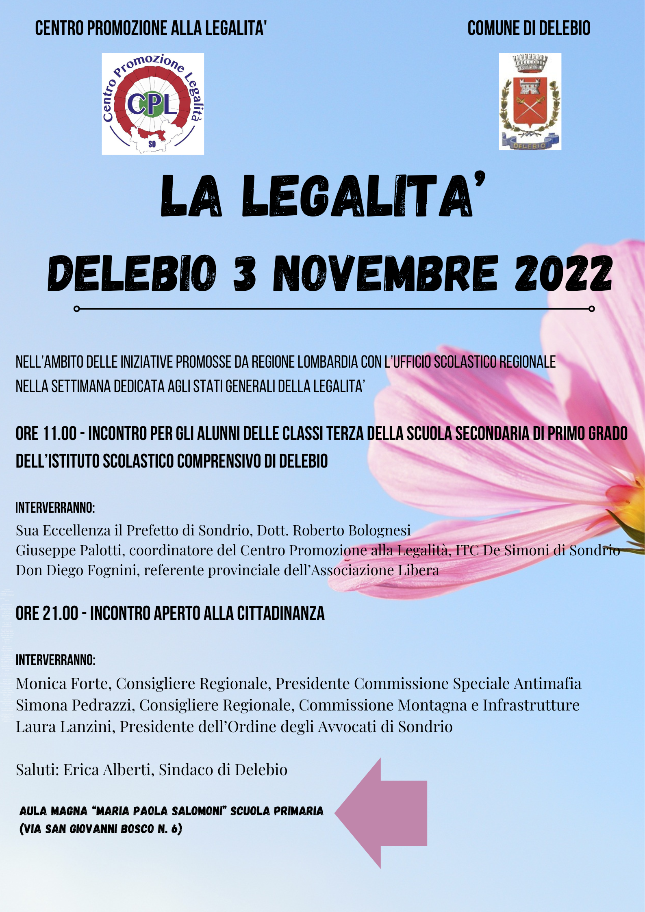 Nell'ambito delle inziative promosse da Regione Lombardia con l'Ufficio Scolastico Regionale nella settimana dedicata agli stati generali della legalità, il Comune di Delebio ha organizzato due eventi nella giornata del 3 novembre: